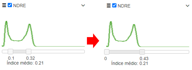 Na visualização de talhão você consegue alterar o histograma (8) de distribuição dos diferentes índices movendo os indicadores na barra deslizante.