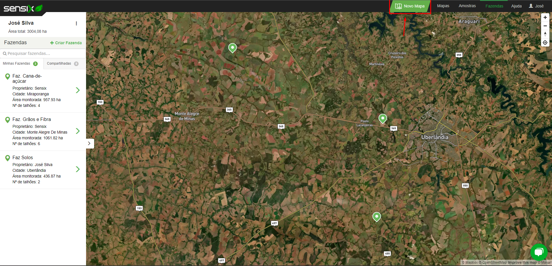 Após ter criado suas fazendas e seus talhões, na página inicial do FieldScan, clique na aba NOVO MAPA: