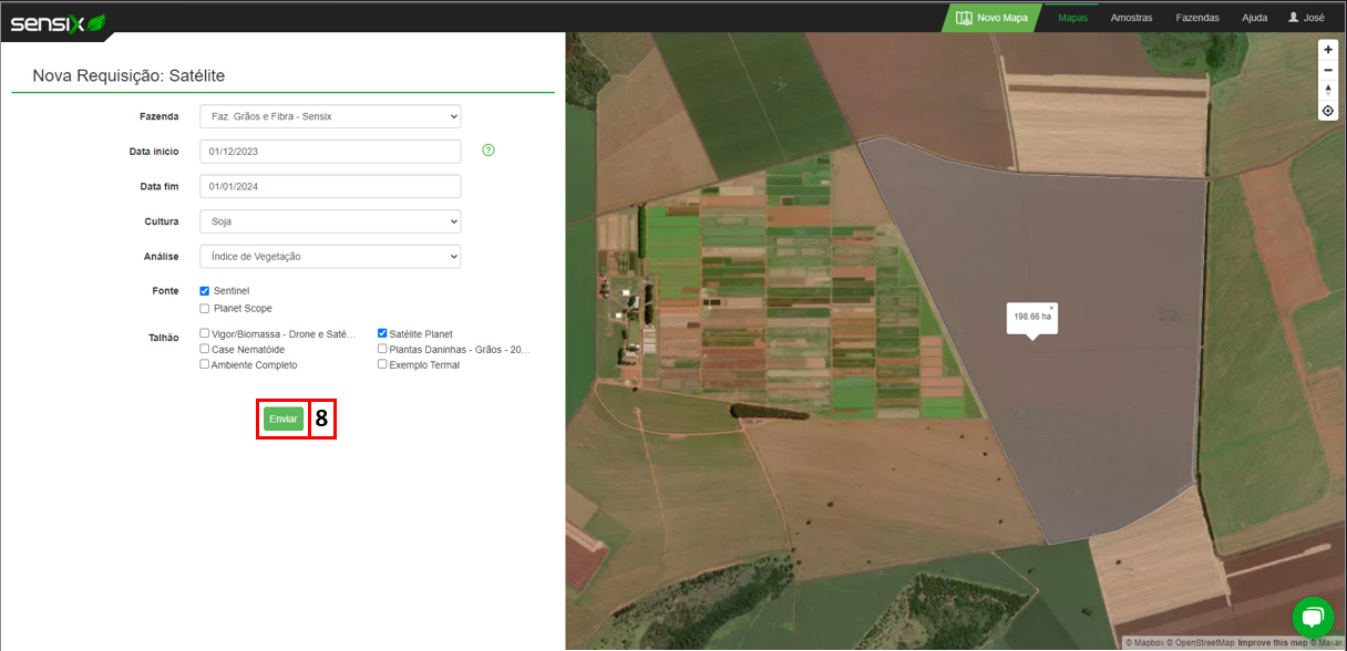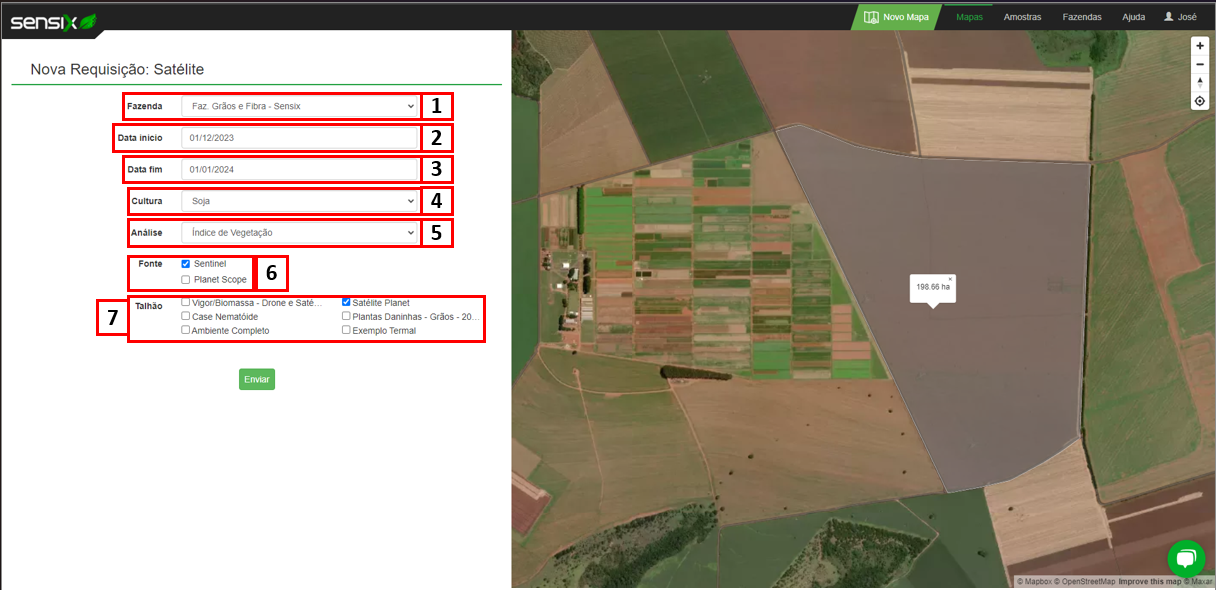 - Talhão (7): selecione o talhão que você deseja obter imagens para monitoramento.