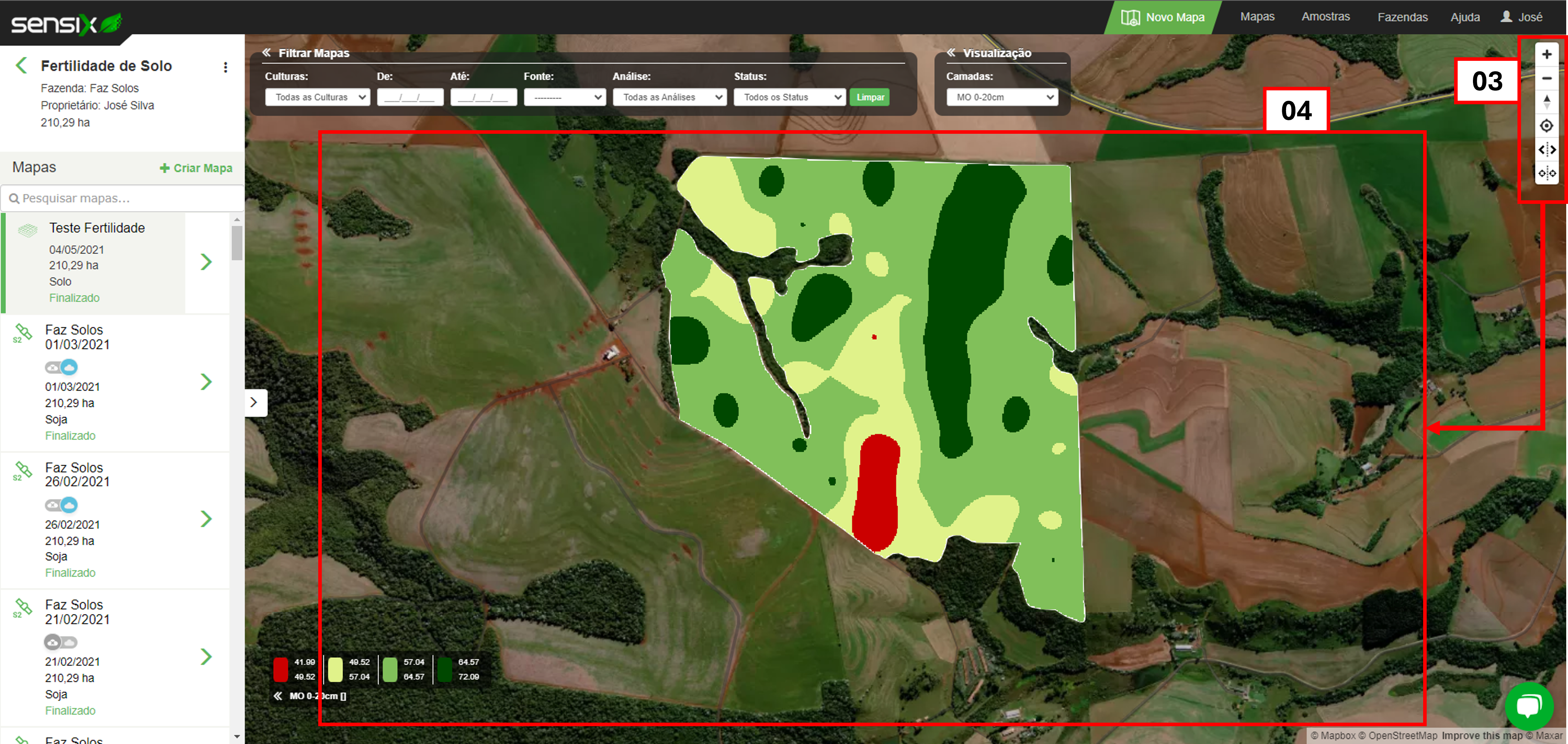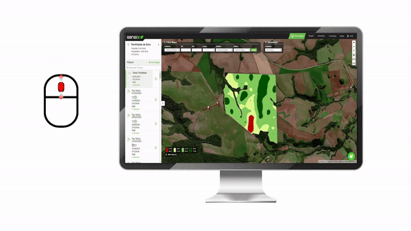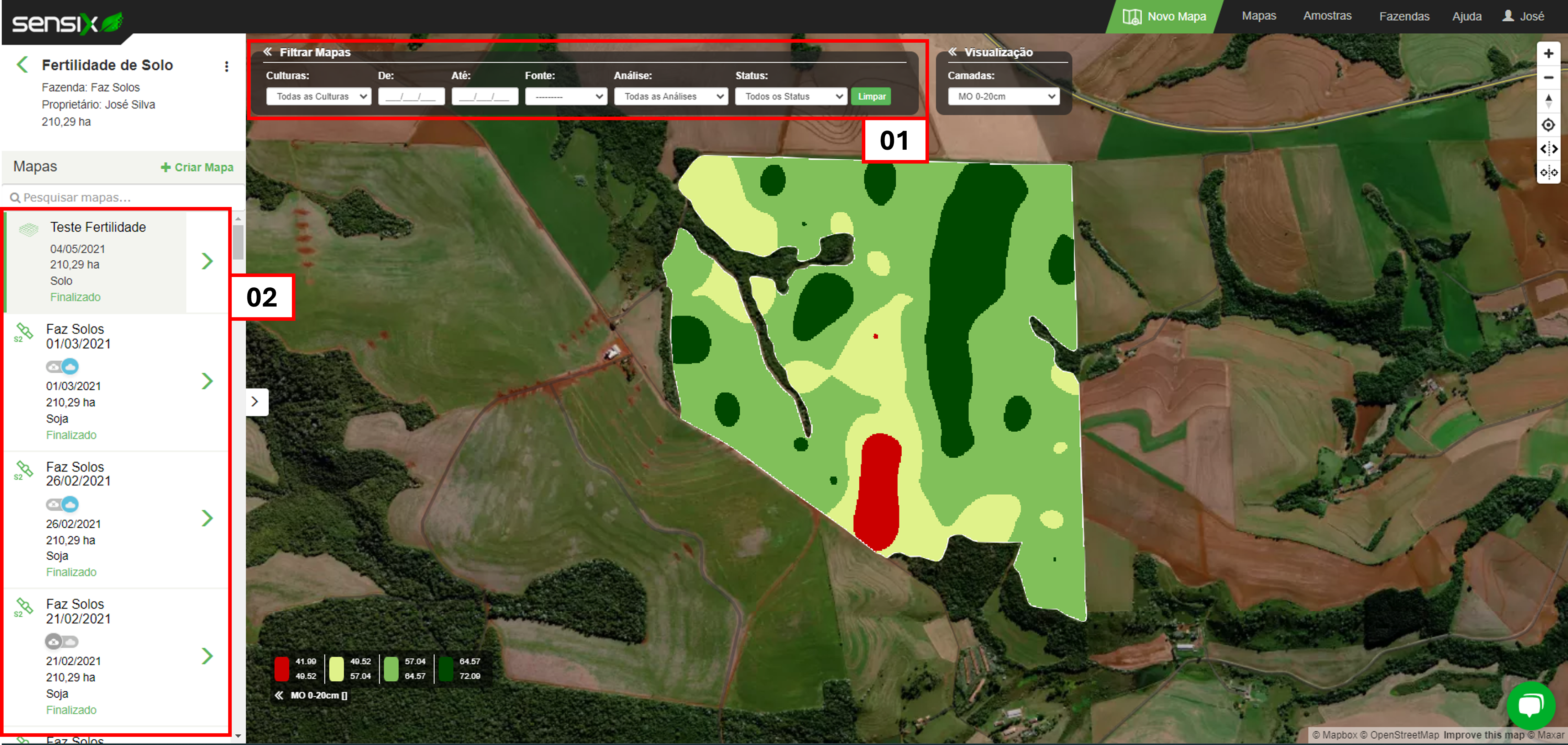 Dentro de cada talhão ficam armazenados todos os dados enviados, utilize os filtros em (1) para selecionar um mapa específico da lista presente em (2):