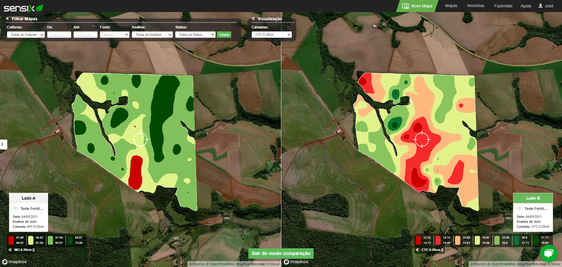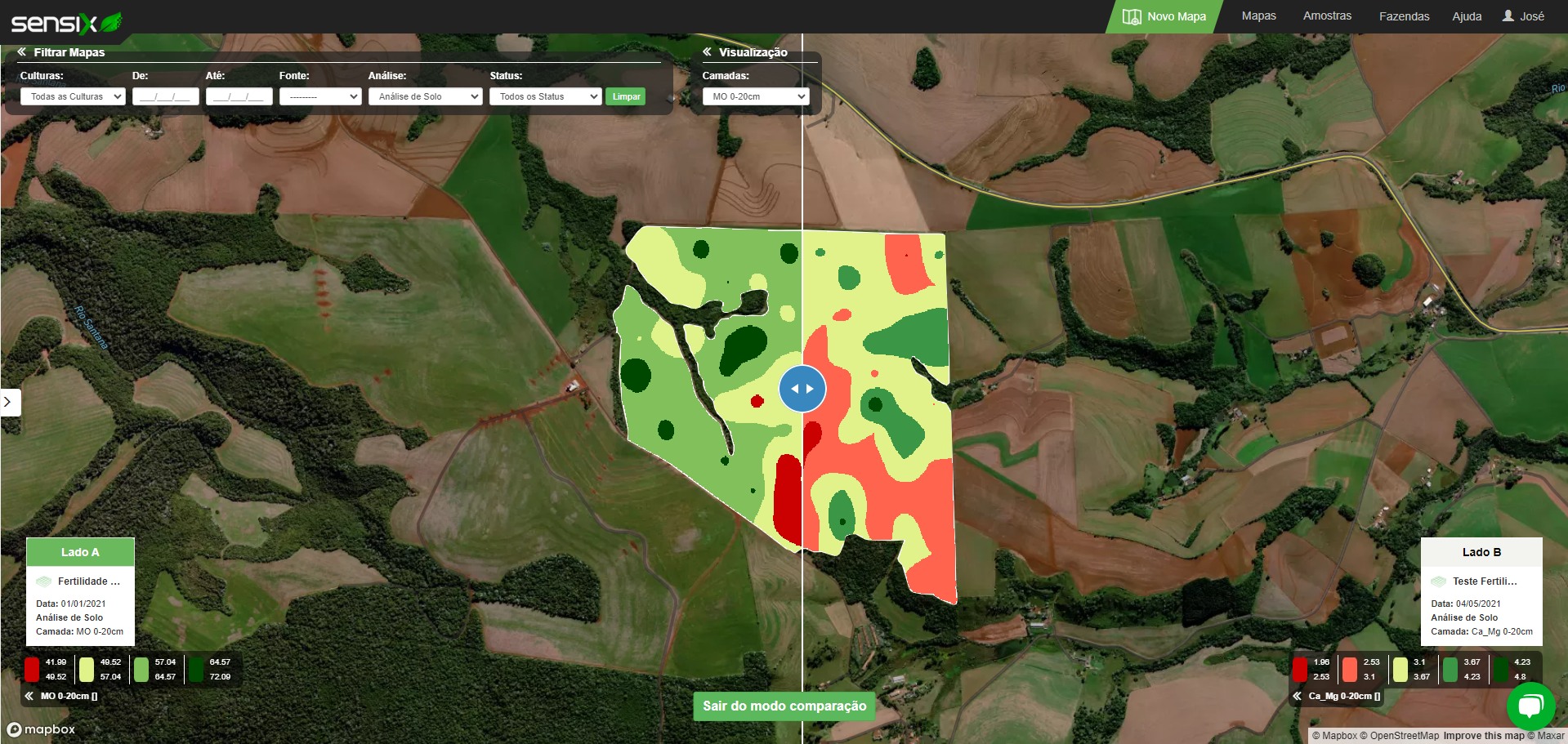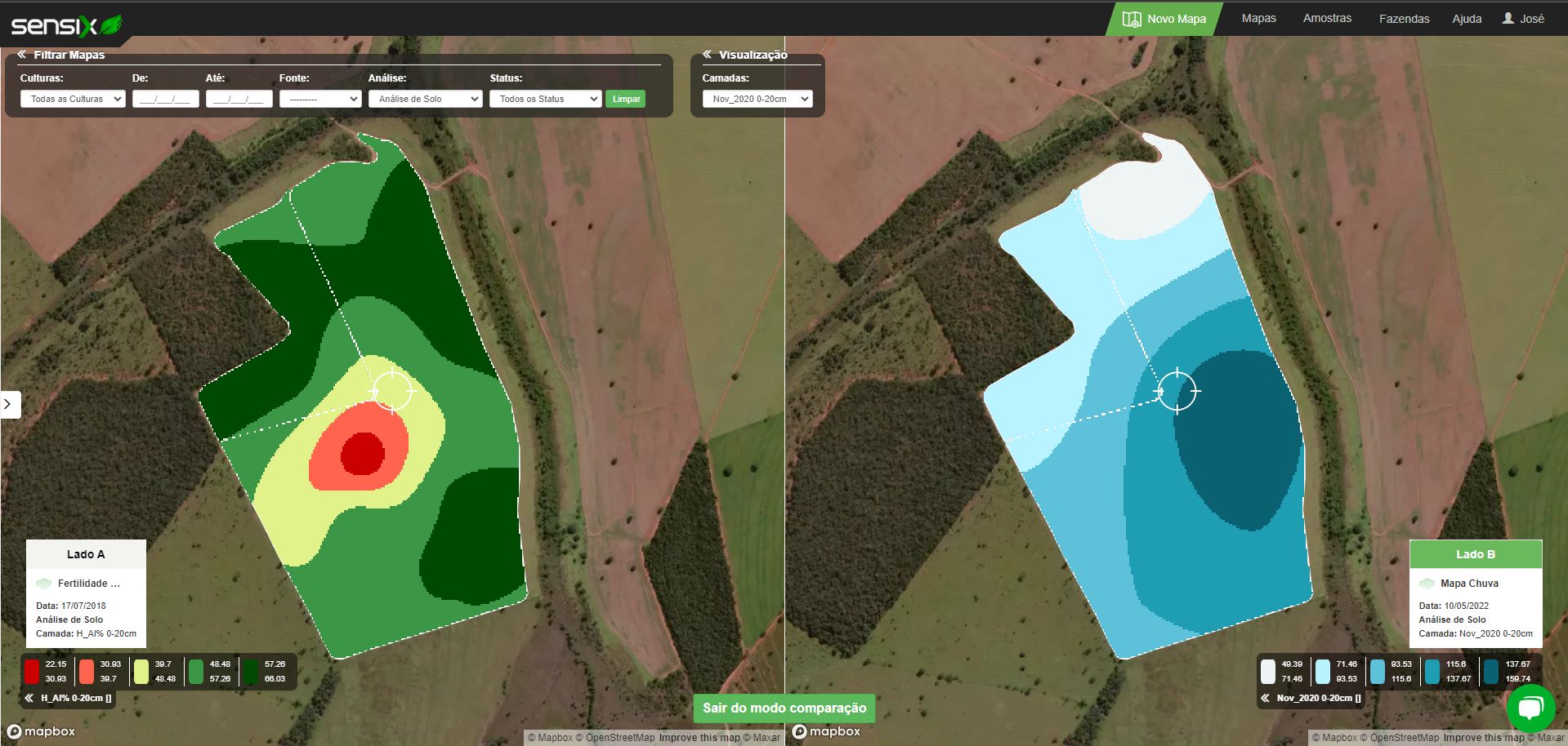 Os dois diferentes modos de comparação permitem que você visualize até dois diferentes mapas cadastrados em um mesmo talhão. Além disso é possível configurar para visualizar diferentes camadas presentes dentro de cada mapa.